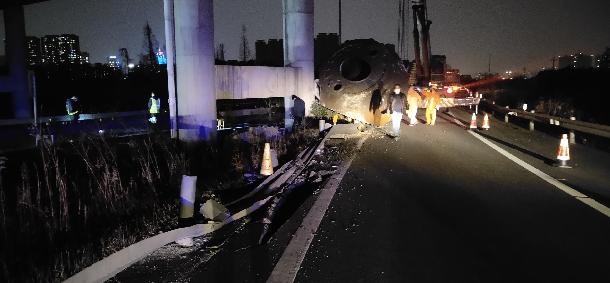 2月25日下午17時(shí)17分,寧波繞城高速東路段姜山北互通F匝道墩柱遭到重量為18噸的貨物撞擊,導(dǎo)致一條車(chē)道封道,影響正常交通通行。事故起因?yàn)楹蠓截涇?chē)跟隨前方小車(chē)急剎導(dǎo)致貨物掉落,貨物掉落后第一撞擊點(diǎn)為路面,滾動(dòng)至橋墩停止。