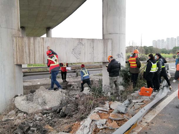 近期我市企事業(yè)單位逐步復(fù)工復(fù)產(chǎn),高速車(chē)輛逐漸增多,為確保新冠肺炎防疫期間高速公路暢通無(wú)阻。事故發(fā)生后,當(dāng)天晚上18點(diǎn)30分,公司“啄木鳥(niǎo)”青年突擊隊(duì)副隊(duì)長(zhǎng)余恒超、隊(duì)員王保磊等組成搶險(xiǎn)應(yīng)急小分隊(duì)第一時(shí)間到達(dá)現(xiàn)場(chǎng)開(kāi)展檢測(cè)工作。經(jīng)初步檢測(cè),橋墩撞擊處對(duì)結(jié)構(gòu)無(wú)嚴(yán)重影響,路面破損處不影響正常通行,立即建議在鋼護(hù)欄破損處設(shè)置皮樁,當(dāng)晚即解除高速封道,恢復(fù)正常通行。受夜間光線不足影響,“啄木鳥(niǎo)”青年突擊隊(duì)第二天一大早再赴事故現(xiàn)場(chǎng)開(kāi)展進(jìn)一步檢測(cè)。