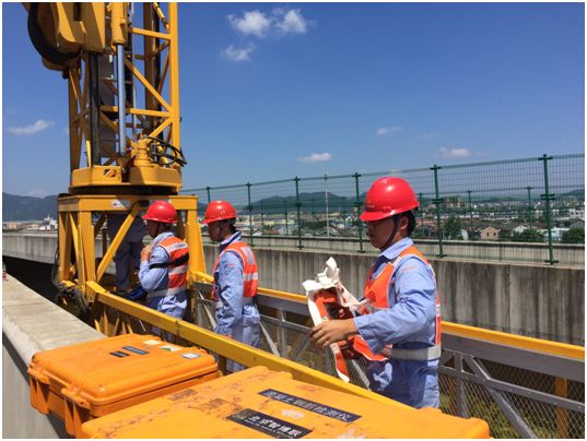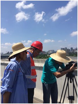 盡管如此,檢測員們?nèi)匀蔽溲b,穿戴好反光背心、安全帽,佩戴上安全帶,頂著烈日在橋檢車上揮汗如雨地工作著。拍攝過程持續(xù)了1個多小時,汗水濕透了我們的衣服又被太陽曬干,但對于檢測員們而言,在這樣的天氣里工作不過是他們的常態(tài)。