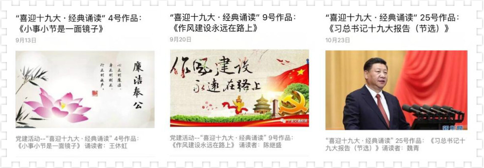 公司黨總支自9月中旬開始,在公司自主開發(fā)的微信公眾號(hào)推送“喜迎十九大·經(jīng)典誦讀”活動(dòng)。每日推送一名黨員同志朗誦的習(xí)近平系列講話等經(jīng)典作品,并在公司“紅色根據(jù)地”黨員微信群和QQ群中組織黨員對(duì)所誦讀內(nèi)容進(jìn)行討論?;顒?dòng)極大地激發(fā)了黨員干部們學(xué)理論、用理論的熱情。大會(huì)召開期間,十九大報(bào)告原文更是成了黨員們首選的誦讀作品。